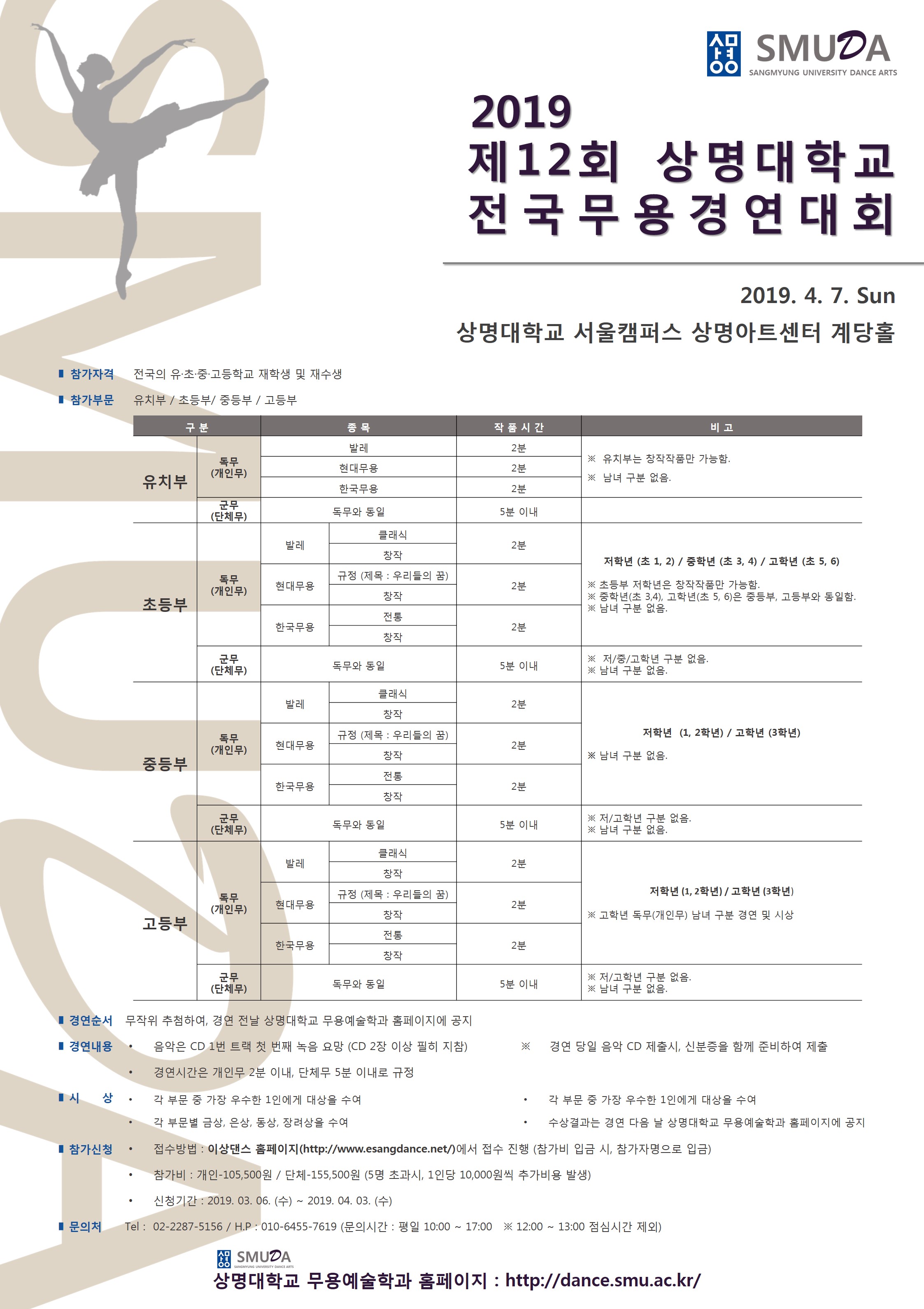 - [콩쿠르] 2019 제12회 상명대학교 전국무용경연대회 규정변경(작품시간 단축) 공지