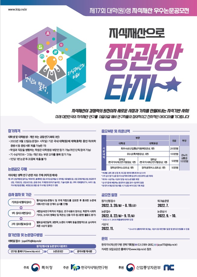 - [한국지식재산연구원] 제17회 대학(원)생 지식재산 우수논문공모전 개최 안내