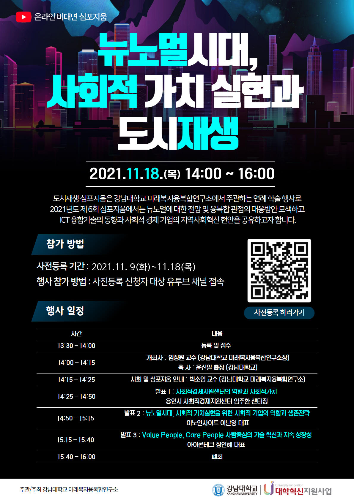 - [강남대학교] 강남대학교 「뉴노멀시대, 사회적 가치 실현과 도시재생」심포지움 안내