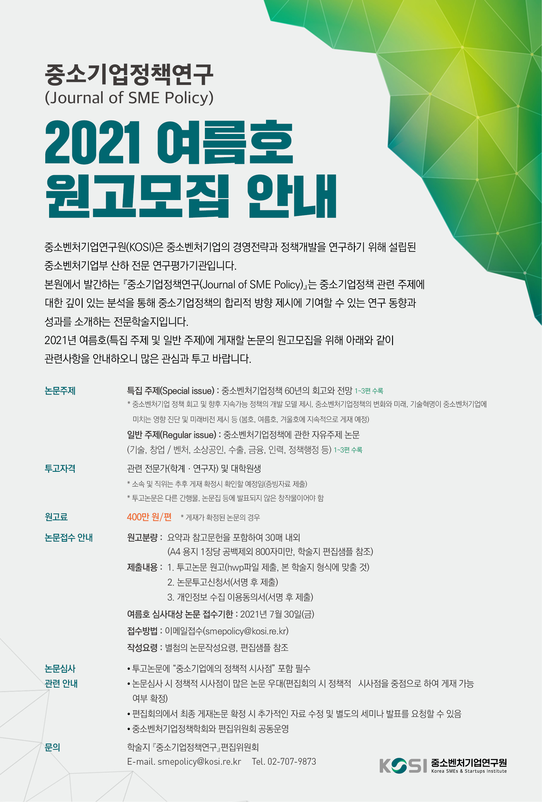 - [일반공지] [중소벤처기업연구원] 중소기업정책연구(Journal of SME Policy) 2021년 여름호 원고 모집 안내