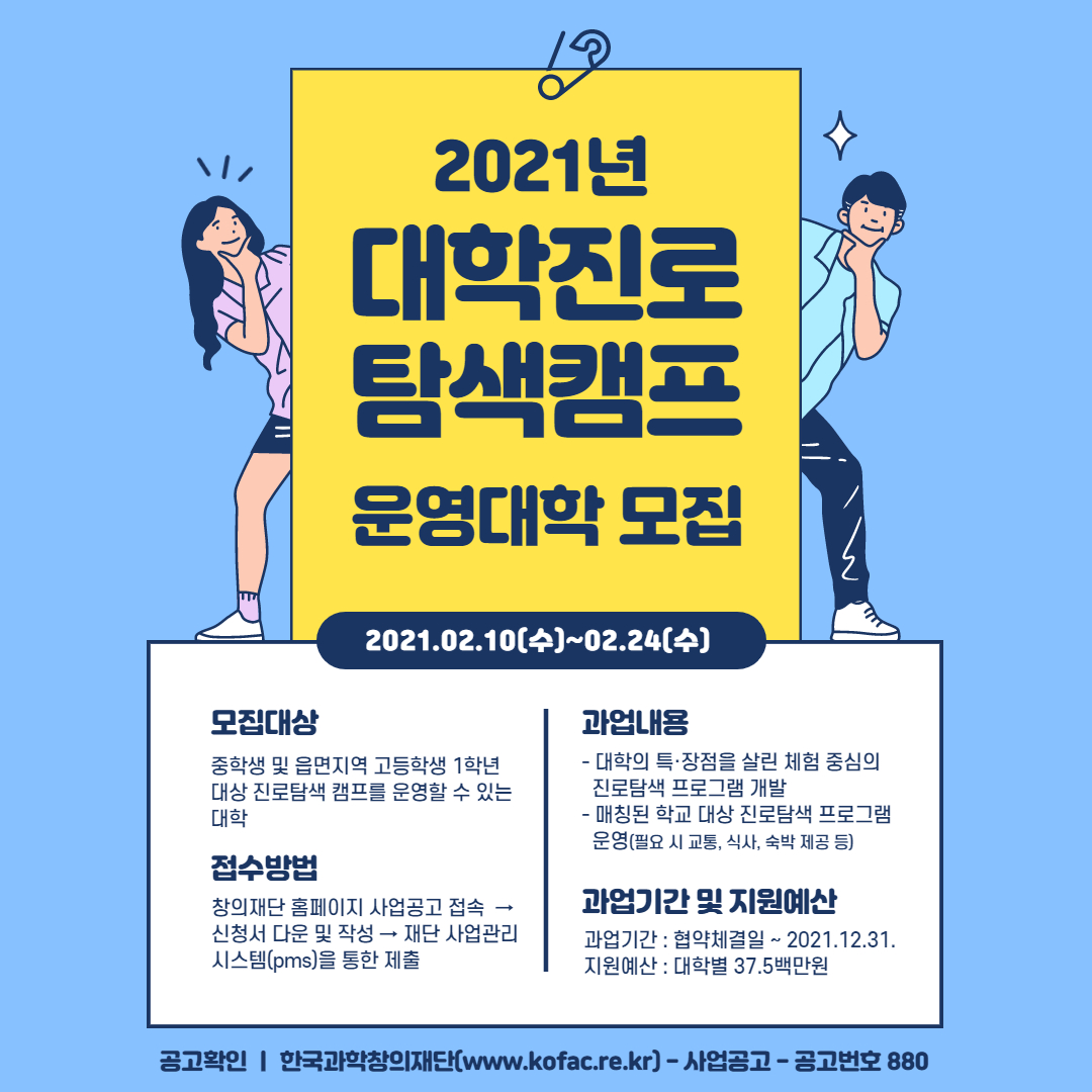 - [한국과학창의재단] 2021년 대학 진로탐색캠프 운영대학 모집 공고 알림