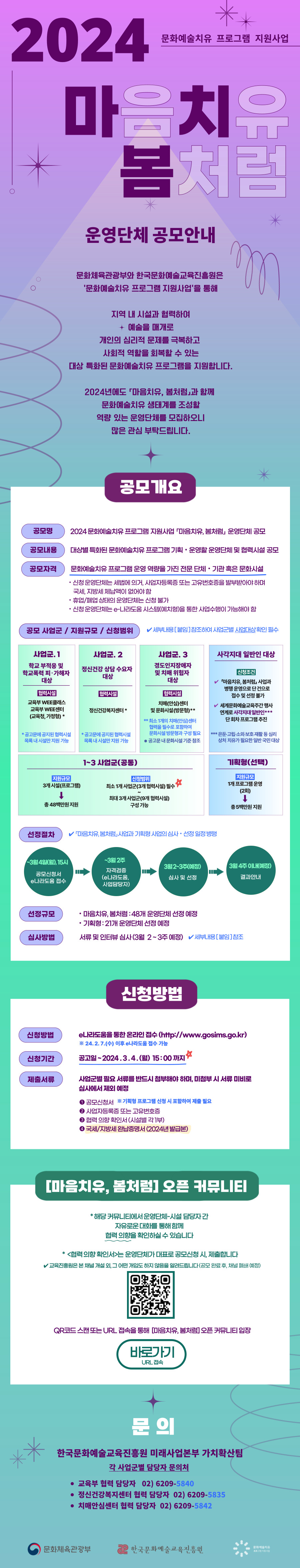- (한국문화예술교육진흥원)2024 문화예술치유 프로그램 지원사업 「마음치유, 봄처럼」 공모