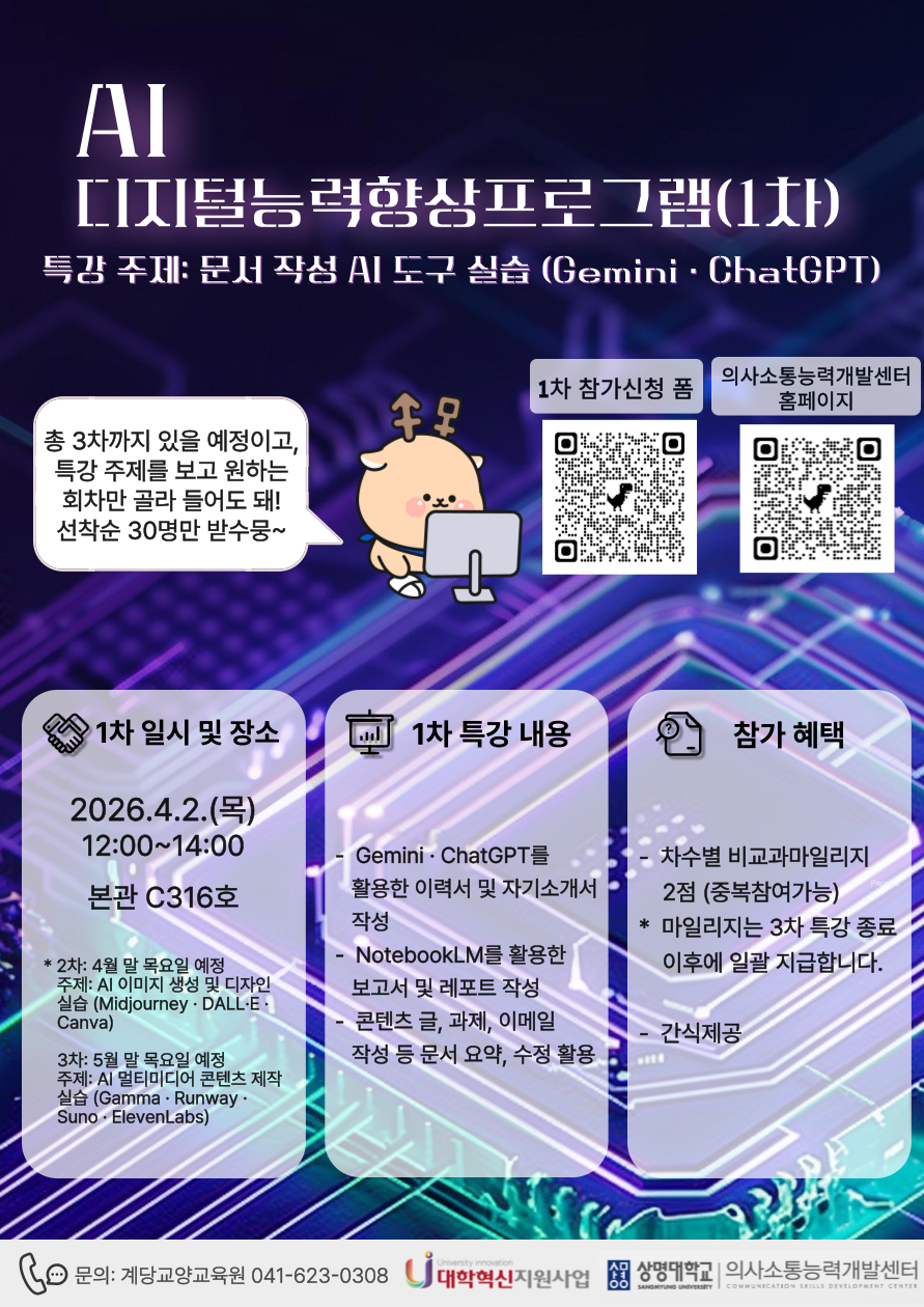 | 천안 [비교과] | [의사소통능력개발센터(천안)] 2026-1 AI 디지털능력향상프로그램(1차) 참여자 모집 |