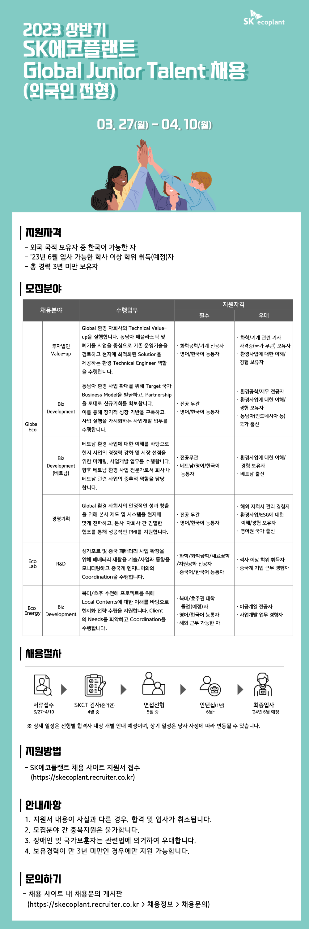 - [취업 및 진로] [SK 에코플랜트] 2023 상반기 Global Junior Talent 채용 (서류 접수 ~4/10)